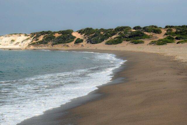 The predominant plants are calyptus, sea lavender, juniper, and the low-growing Halepa pine, which is adapted to salty winds and heat. These species are drought-resistant and create a stable ecosystem that protects the coastal soil from erosion.