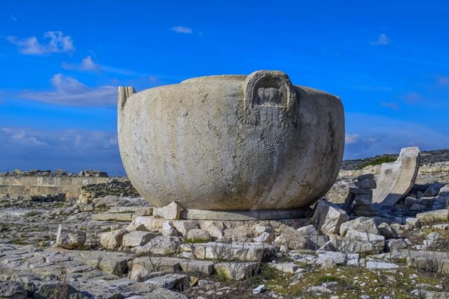 - The Acropolis with the ruins of the Temple of Aphrodite and a monumental stone vessel weighing about 13 tons, probably used for fertility rituals.