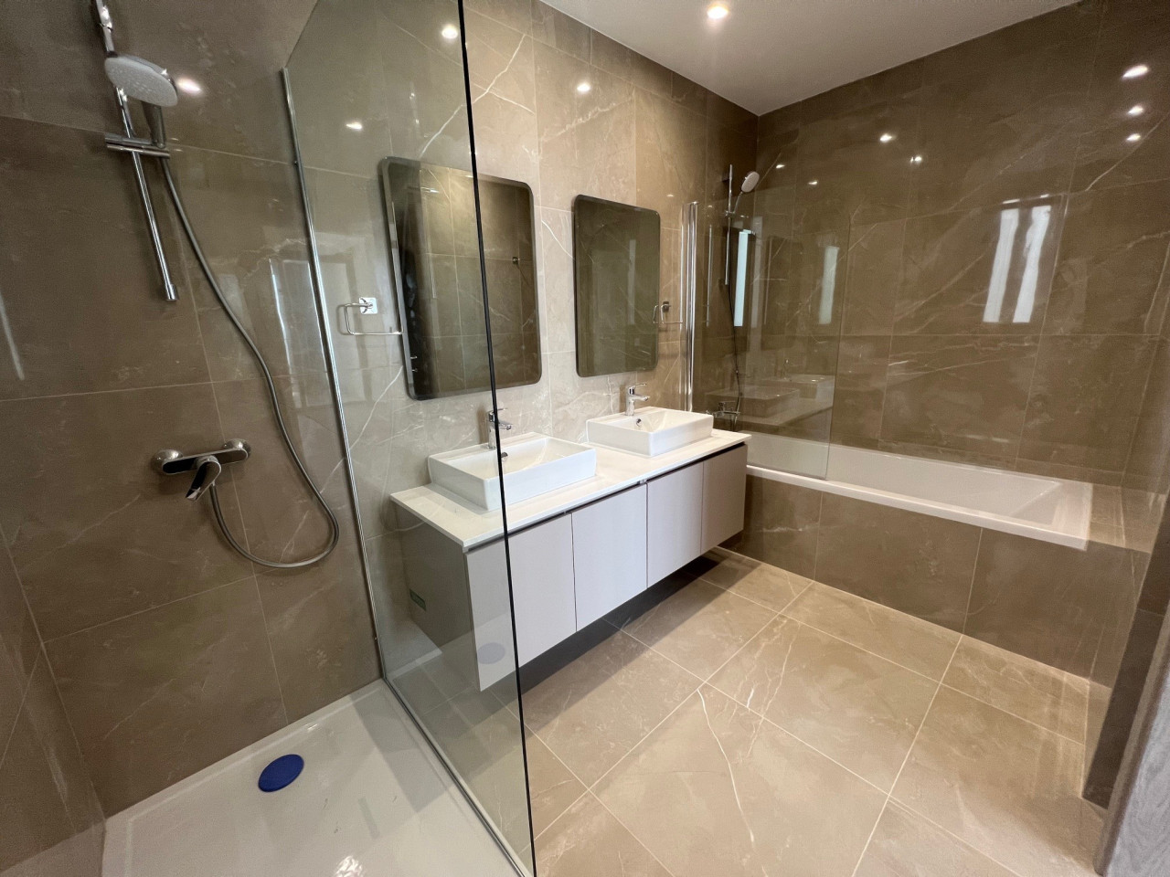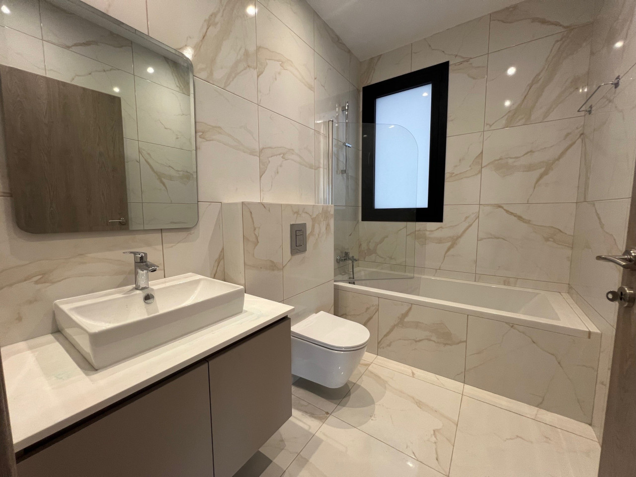 It consists of an open-plan kitchen connected with a dining and living area, 3 bedrooms (2 bedrooms en-suite with shower and bathtub) and a family bathroom.