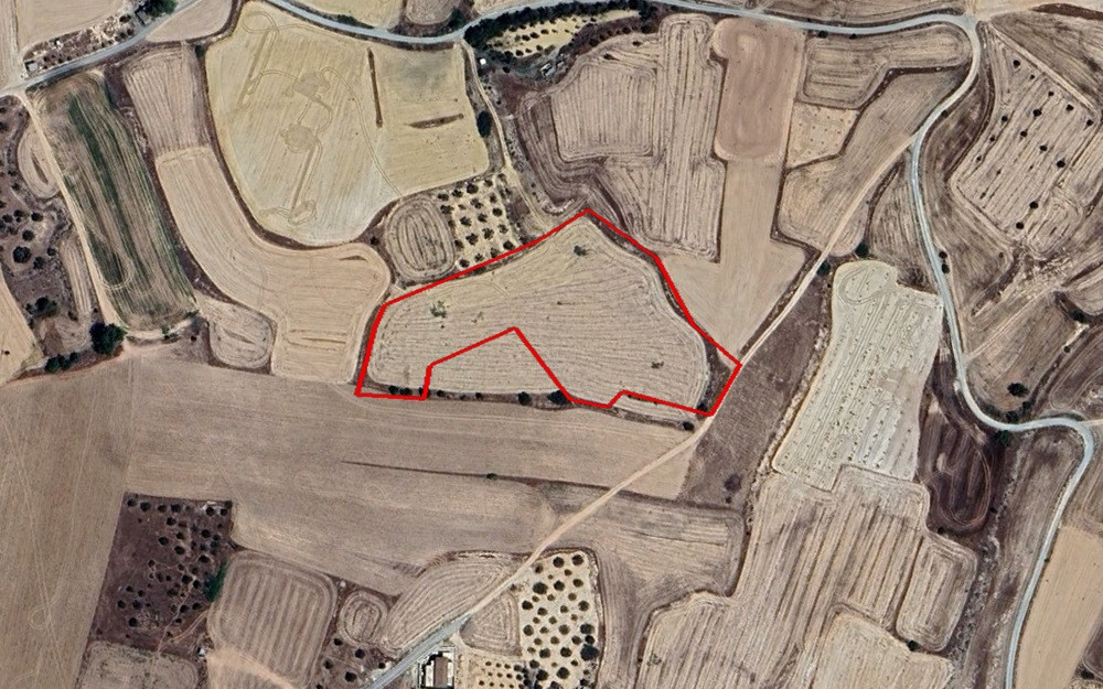 A residential field for sale in Athienou in Larnaca. The property has an area of 15,385 sq.m. and 36m road frontage along a registered road. It falls within two planning zones: