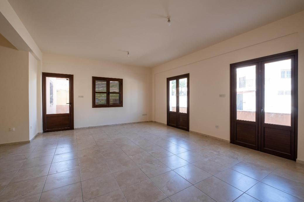 Ground floor house part of a residential building in Agios Theodoros. The house has an enclosed area of 136 sq.m., covered verandas of 13 sq.m., uncovered verandas of 32 sq.m., and parking space of 24 sq.m. The house consists of a living room, kitchen, guest toilet, three bedrooms (the main is ensuite), and a bathroom/toilet. Externally, there is a double covered parking space. The property is vacant.