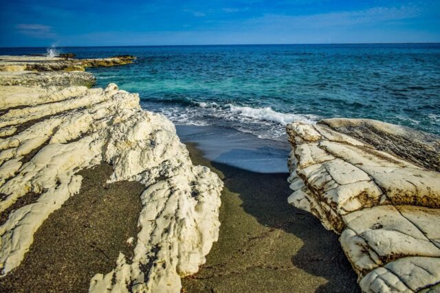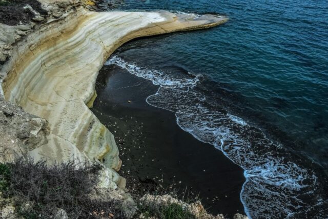 Governor’s Beach is located on the southern coast of Cyprus, approximately 30 kilometers east of Limassol and 40 kilometers west of Larnaca. This picturesque stretch of coastline features a soft sandy strip and snow-white chalk cliffs that contrast dramatically with the dark volcanic sand and azure sea.