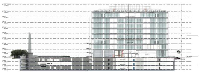 The project calls for a building with three basements, a spacious ground floor, and seven full floors, plus a roof. The building will rise to approximately 41 meters (to the gable end). The total floor area of the two buildings will be 5,647 square meters , with 90% of the site covered by impermeable pavement, corresponding to approximately 5,000 square meters of total development area.